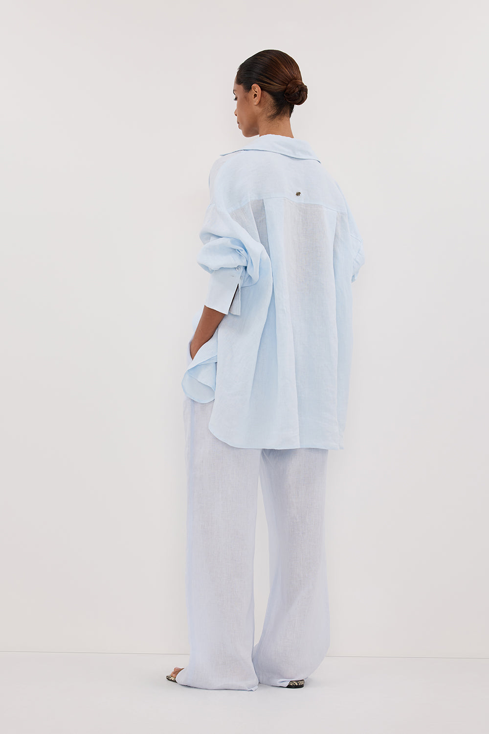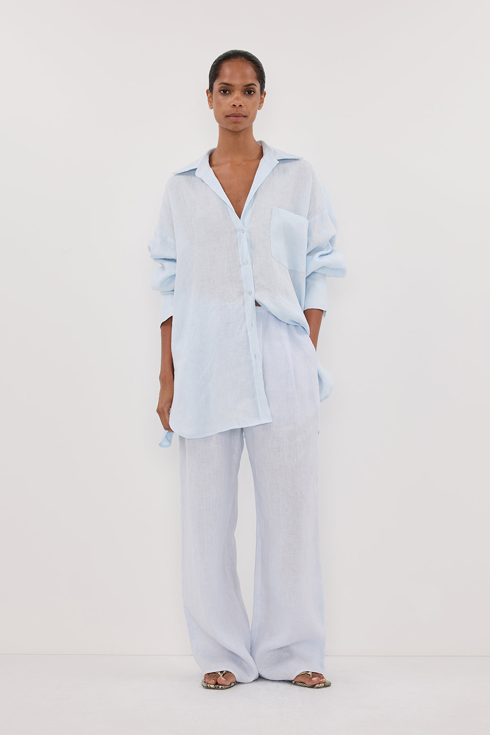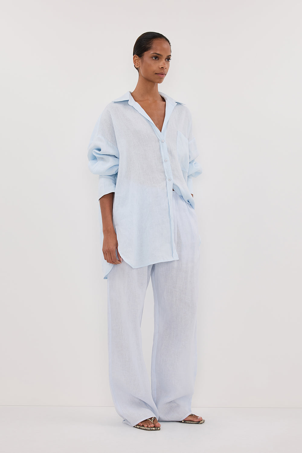 Mid rise blue linen pant Narrow elasticated waistband Adjustable tie detail Designed for a relaxed silhouette through leg