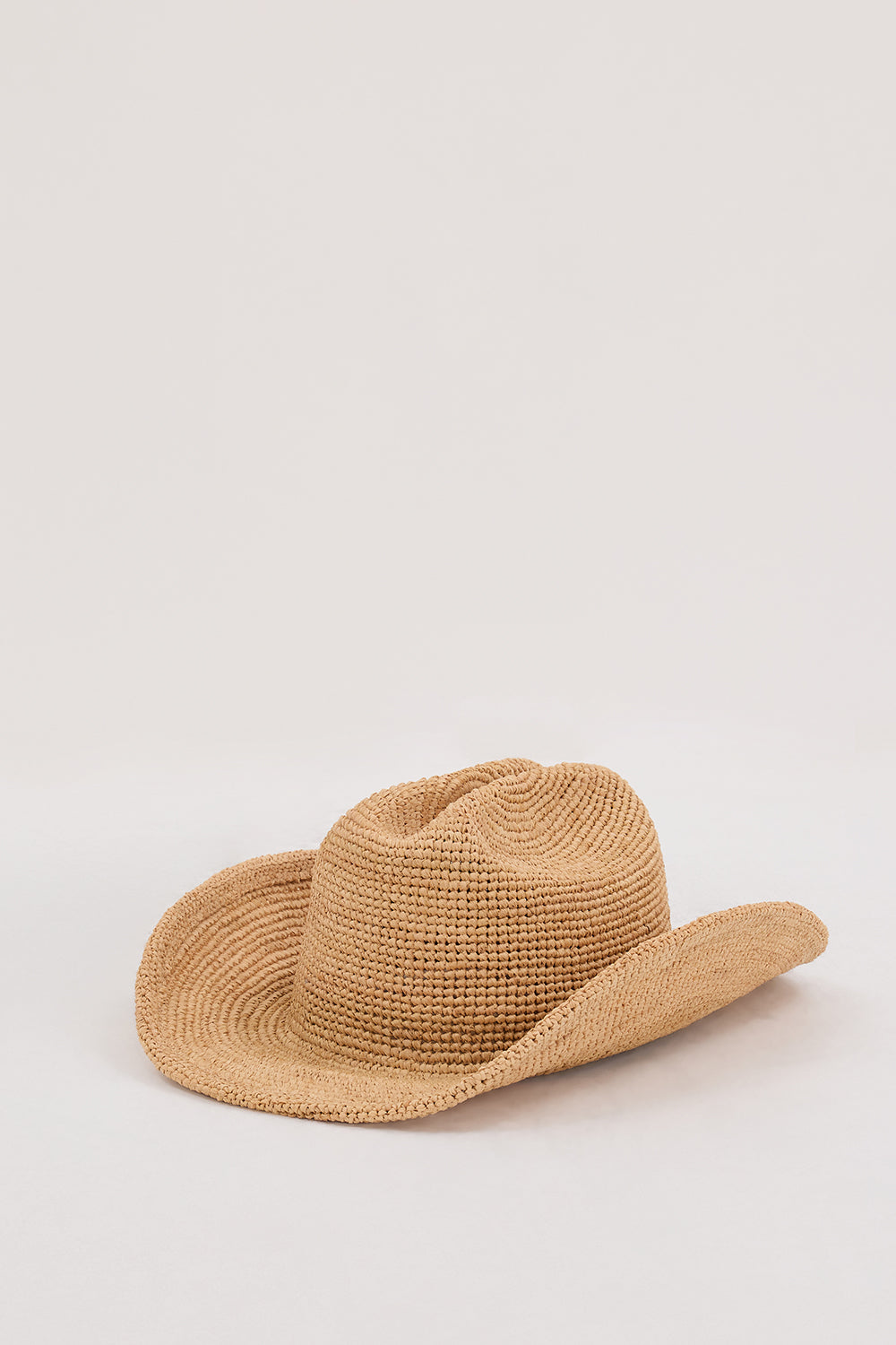 Hand crocheted 100% raffia straw cowboy hat by Lack of Colour Cattleman crown with flicked brim edge Larger scale hand crochet raffia with structured hand feel Wire in brim edge to maintain shape Tightly woven The highest achievable sun protective rating for fabrics, UPF 50+ (Australian tested) hats offer unbeatable sun protection.