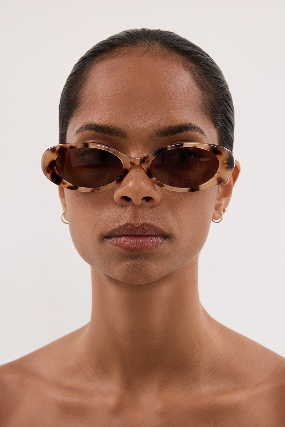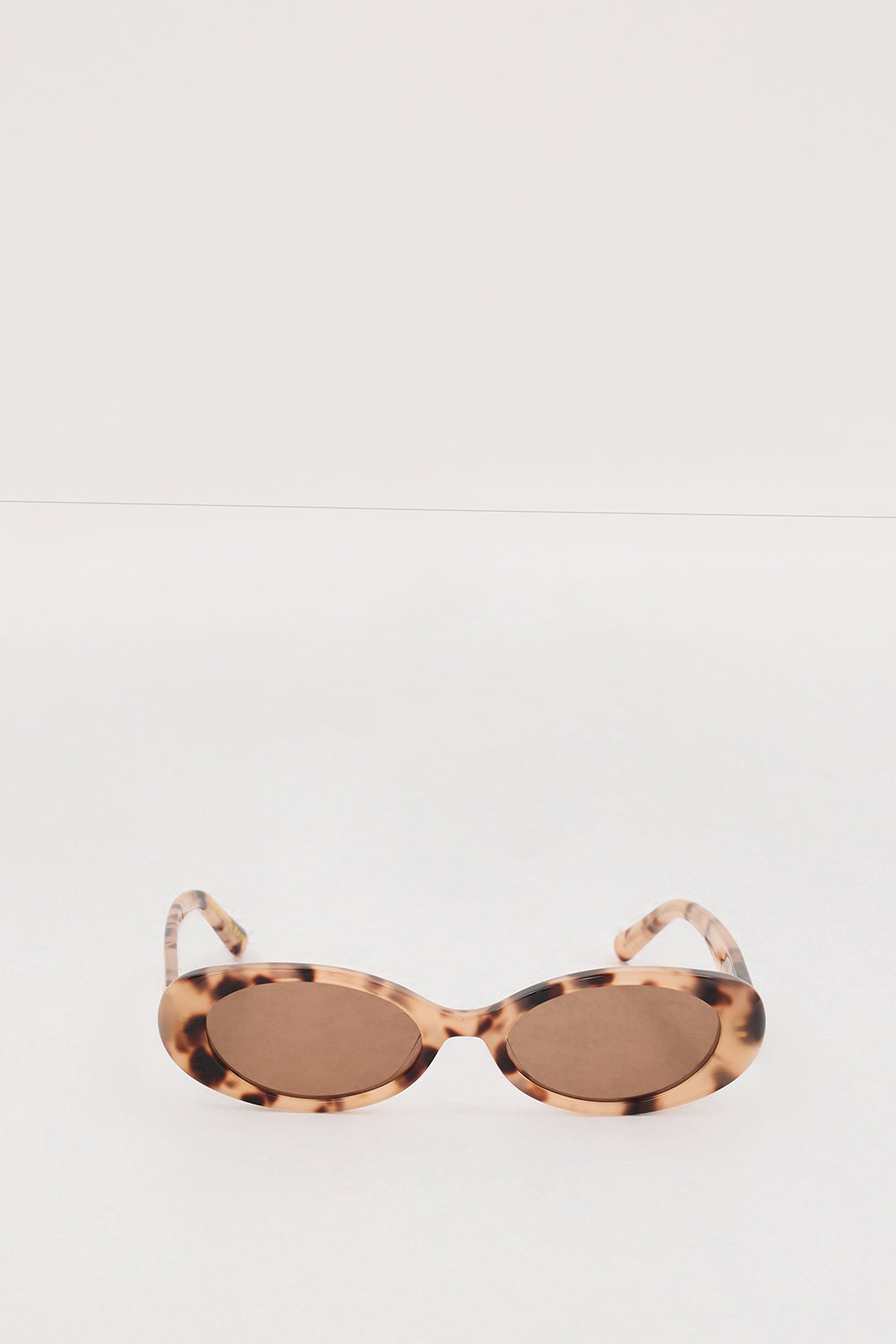 Tort oval sunglasses by Luv Lou Medium size Brown mono lenses Organic Luv Lou ‘L’ decal at temples Gold wire core and hinges Category 3 UV protection